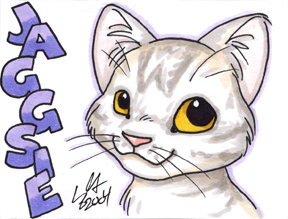 Jaggsie is a young female Honey Bear cat. She has long luxurious fur that is snowy white with dark gray stripes, and her legs are relatively short with rounded paws and large tufts of fur. Her fluffy tail resembles that of a skunk, which swishes about as if with a mind of its own. She's got a small pink triangular nose, long whiskers, and bright golden eyes gleaming with spirit and curiosity.